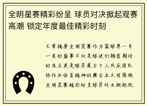 全明星赛作为篮球界一年一度的盛事,不仅是球迷们翘首期待的焦点,更是球员展示个人风采、团队协作和体育精神的舞台。本文将围绕“全明星赛精彩纷呈,球员对决掀起观赛高潮,锁定年度最佳精彩时刻”这一主题展开,详细分析全明星赛的四大亮点。首先,通过球员的激烈对决展现了比赛的高水平和高强度;其次,明星球员的精彩表现不仅点燃了观赛气氛,也成就了无数经典瞬间;第三,赛事中的创意和创新让比赛充满了新意,吸引了大量观众;最后,令人难忘的赛后回顾和对决结果不仅成为了话题讨论,也让全明星赛成为年度最佳时刻之一。文章将从这四个方面逐一阐述全明星赛的独特魅力,帮助读者更好地了解这一盛大赛事的精彩之处。