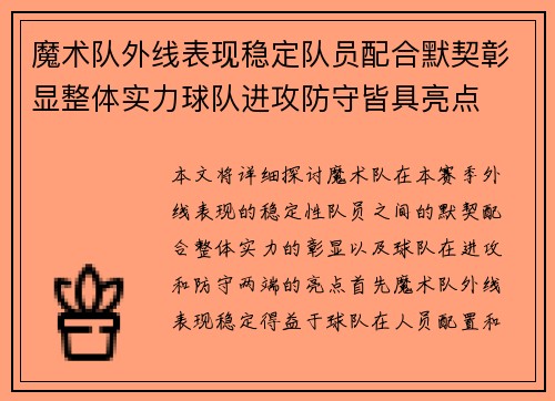 本文将详细探讨魔术队在本赛季外线表现的稳定性、队员之间的默契配合、整体实力的彰显,以及球队在进攻和防守两端的亮点。首先,魔术队外线表现稳定,得益于球队在人员配置和战术执行上的不断优化,外线球员通过精准的投篮和多变的进攻手段,有效地打开了局面。其次,队员之间的默契配合是魔术队取得成功的关键,特别是在快速转换进攻和防守协作方面。整体实力的提升则反映了球队在进攻端和防守端的平衡,二者相辅相成,使得魔术队在本赛季的竞争力大增。最后,魔术队在进攻和防守两端的亮点相互交织,共同推动着球队的发展。本文将围绕这几个方面展开深入分析,全面剖析魔术队的实力和未来潜力。