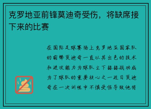 根据克罗地亚足协的官方声明,莫迪奇的伤情为肌肉拉伤,虽然伤势并不严重,但医生建议他需要进行充分的休养和恢复,因此无法参加接下来的国际比赛和俱乐部赛事。尽管这对于莫迪奇个人来说是一次不小的打击,但对整个克罗地亚队来说,也将是一次巨大的挑战。