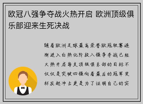 随着欧洲足球最高荣誉——欧冠联赛逐渐进入白热化阶段,八强争夺战已经火热开启。每支顶级俱乐部的目标不仅仅是突破四强,向着最后的冠军奖杯发起冲击,更是为了证明自己的实力与荣耀。在这场没有硝烟的战斗中,各大豪门球队将一决高下,迎来生死存亡的关键时刻。本文将从四个方面深入分析欧冠八强争夺战的热血氛围,分别从球队实力对比、战术策略博弈、明星球员表现以及俱乐部历史荣耀等角度,探讨当前阶段欧冠赛事的精彩纷呈及其背后的深层意义。